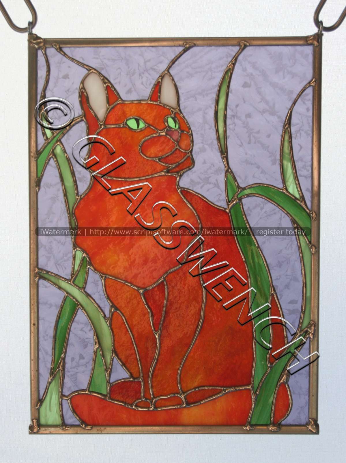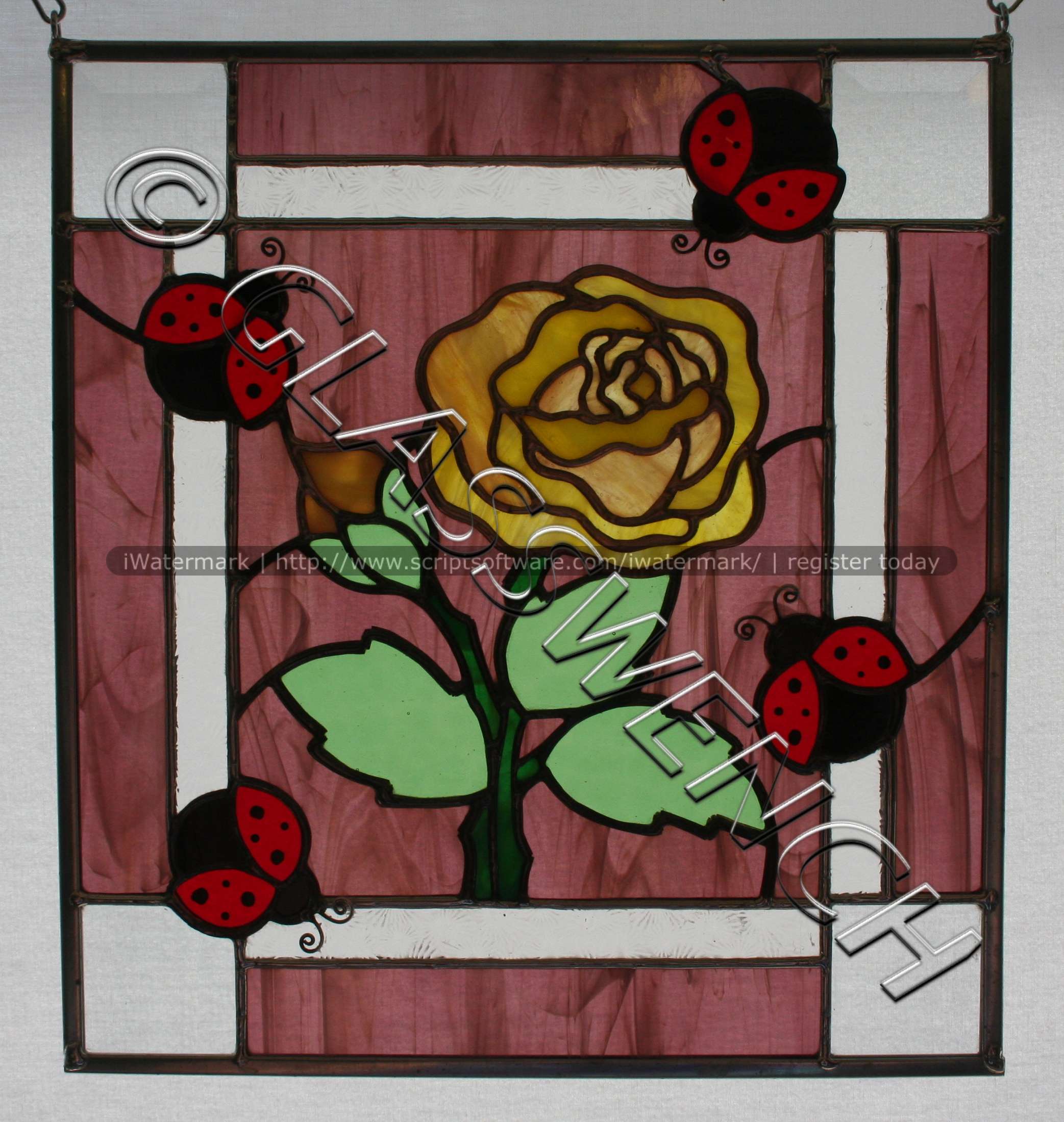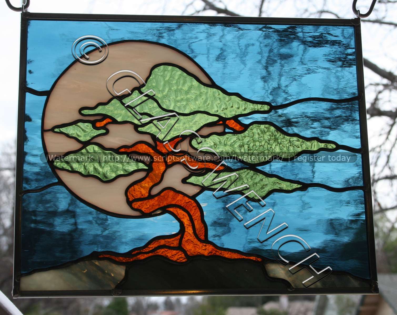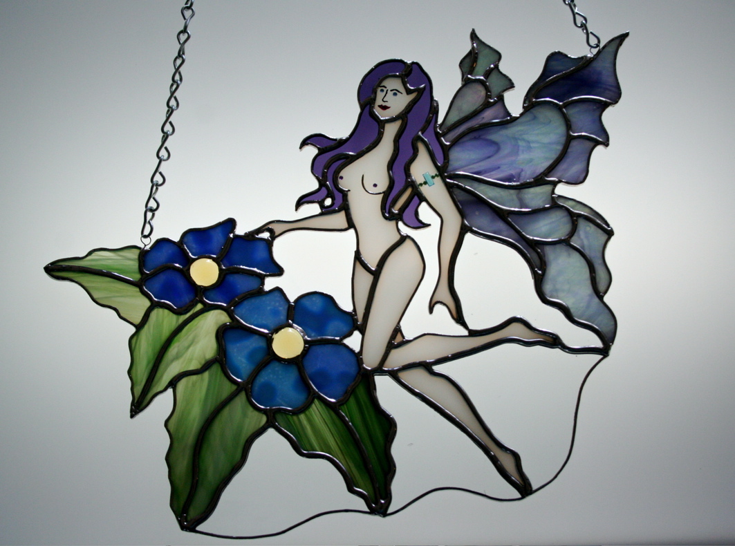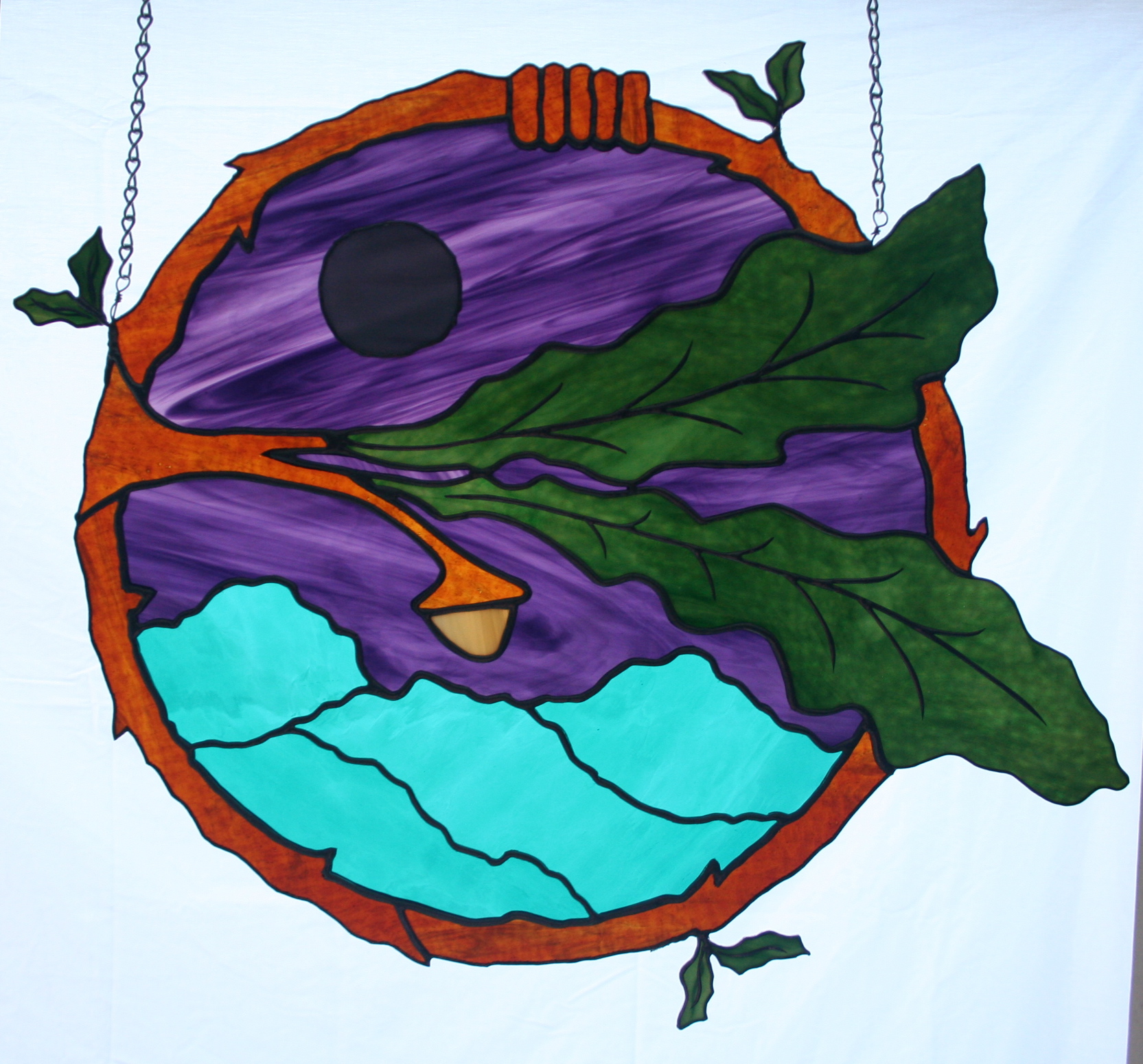 This piece was commissioned by a High Priestess of a Wiccan coven. Too dang cool. The pattern was taken from the original drawing artwork of one of the coven members. I did alter it slightly, so as to make the soldering work. The full moon is cemented on top of the purple glass, and is white, though that is impossible to tell from this photo. This was one of my earlier pieces and sadly, the solder came apart at the chain on the right, and some of the glass broke. I repaired it and inset it inside a rectangle of clear baroque glass, and framed it in a beautiful wood frame. quite sturdy now, but no photo of the final look.
