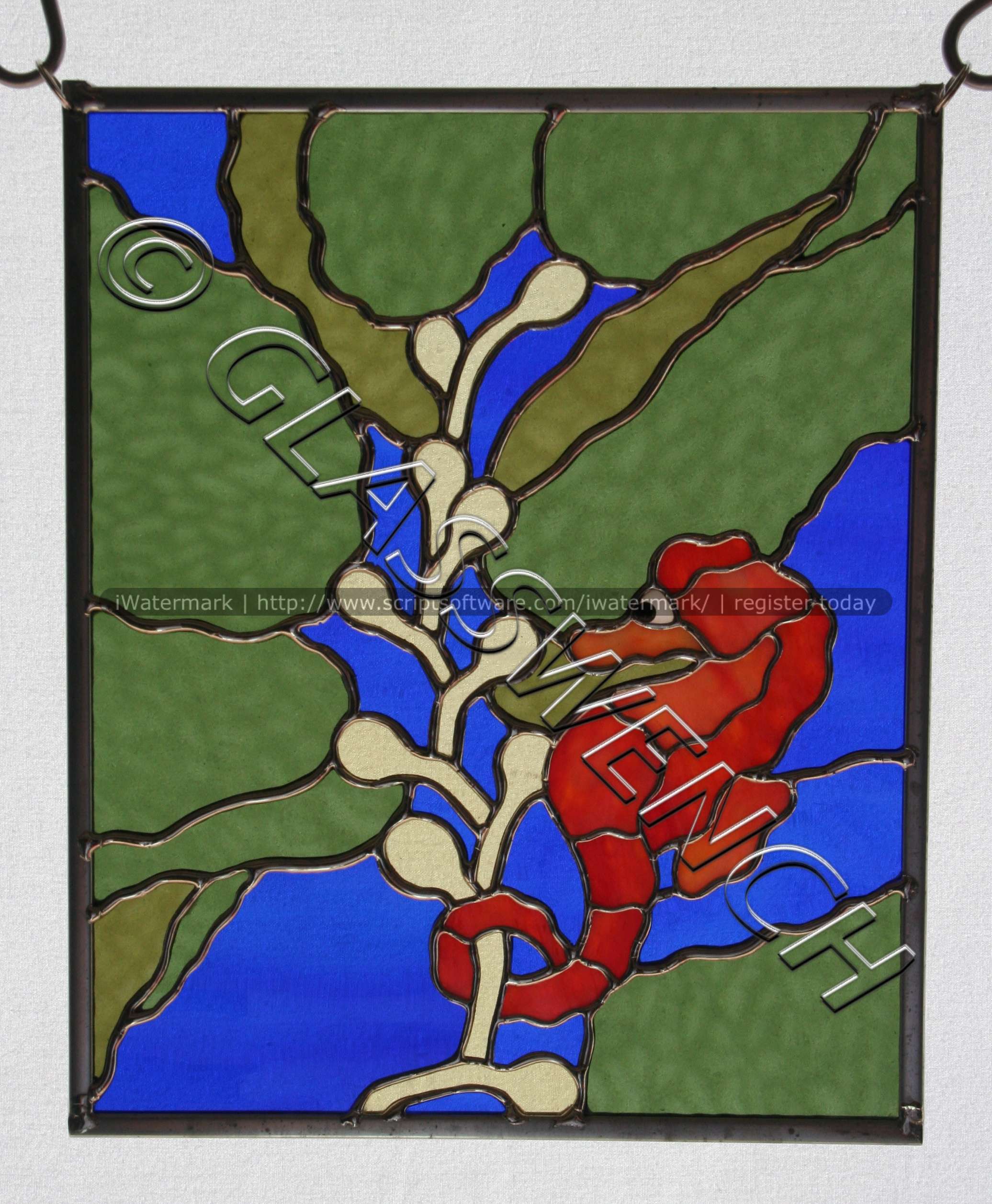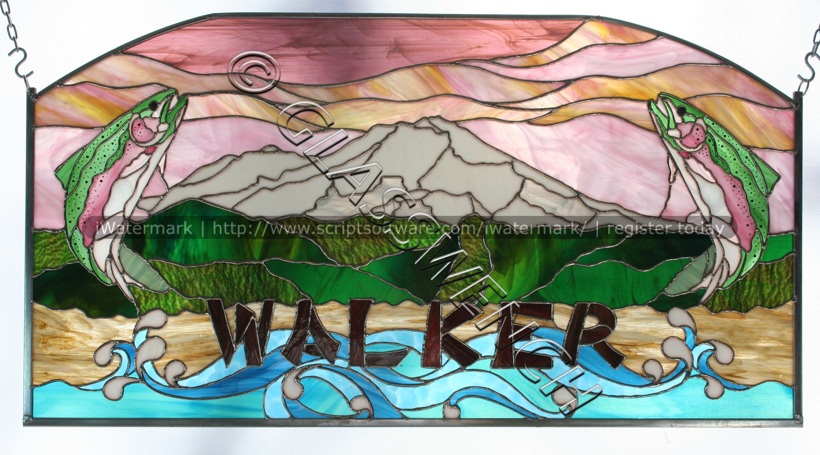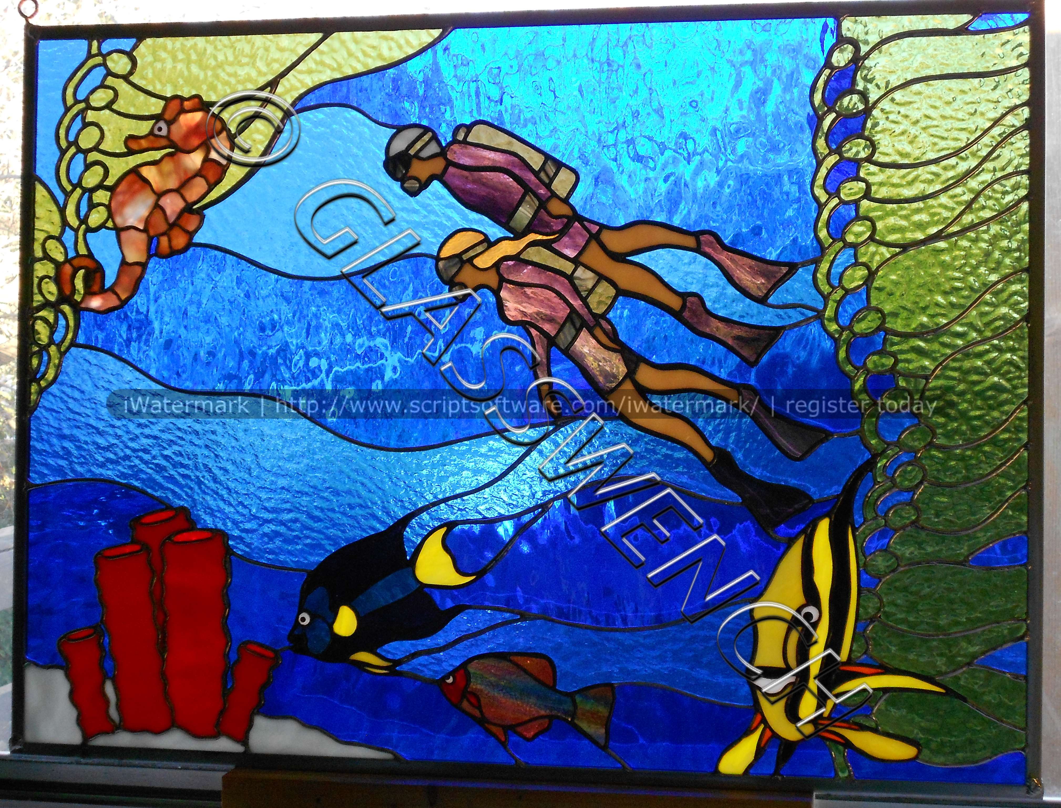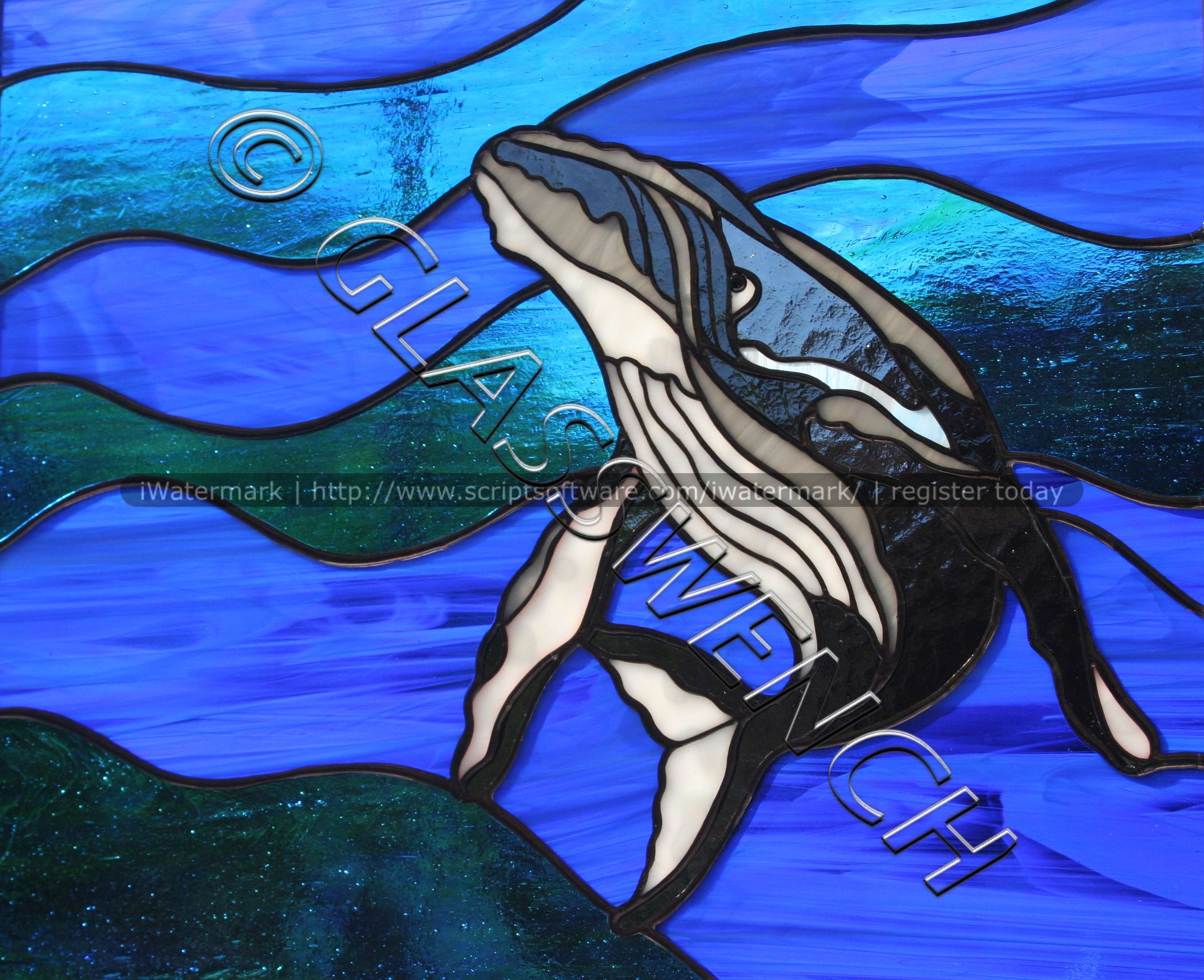 This piece was commissioned by a High Priestess of a Wiccan coven. Too dang cool. The pattern was taken from the original drawing artwork of one of the coven members. I did alter it slightly, so as to make the soldering work. The full moon is cemented on top of the purple glass, and is white, though that is impossible to tell from this photo. This was one of my earlier pieces and sadly, the solder came apart at the chain on the right, and some of the glass broke. I repaired it and inset it inside a rectangle of clear baroque glass, and framed it in a beautiful wood frame. quite sturdy now, but no photo of the final look.