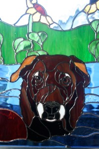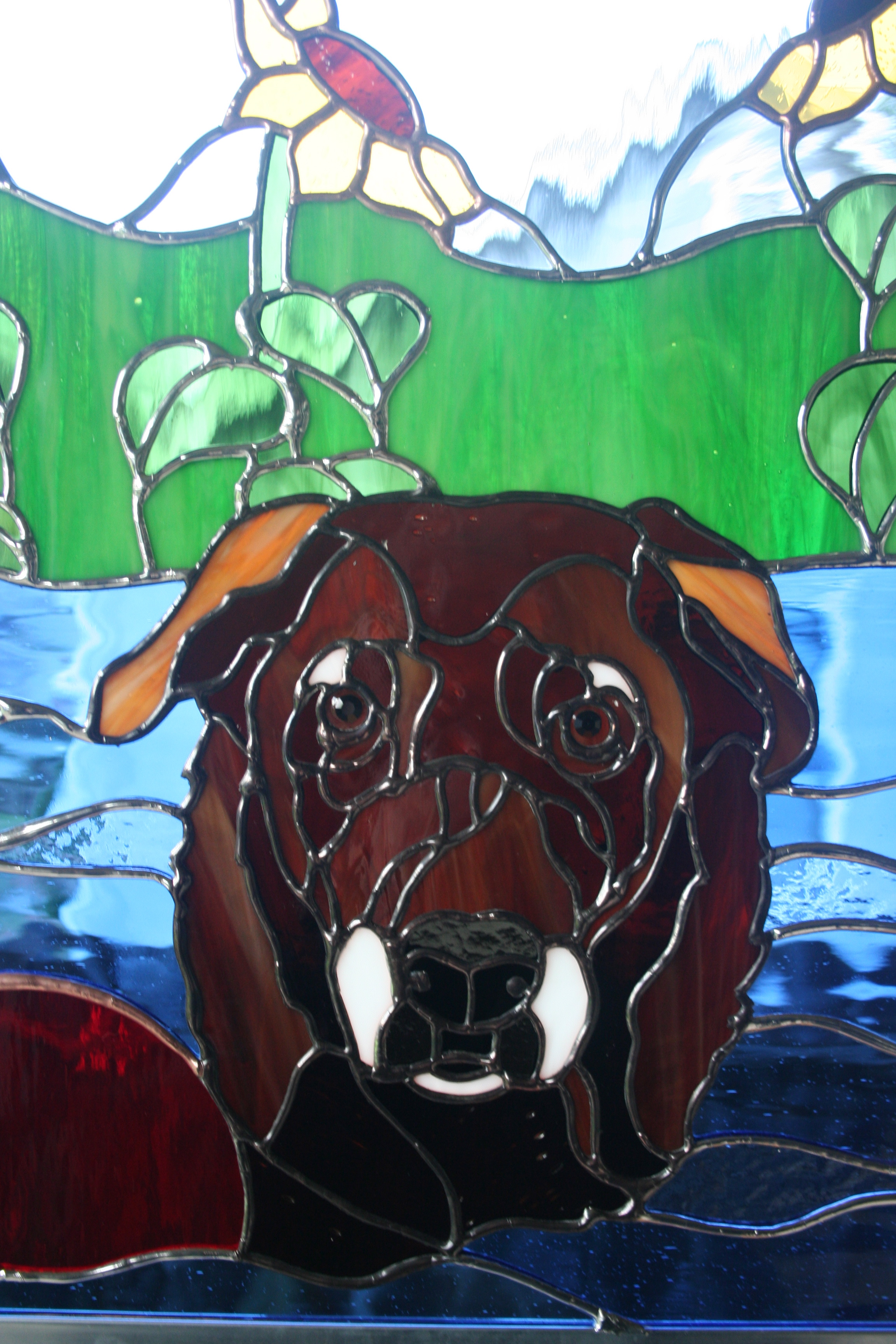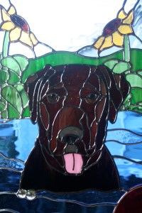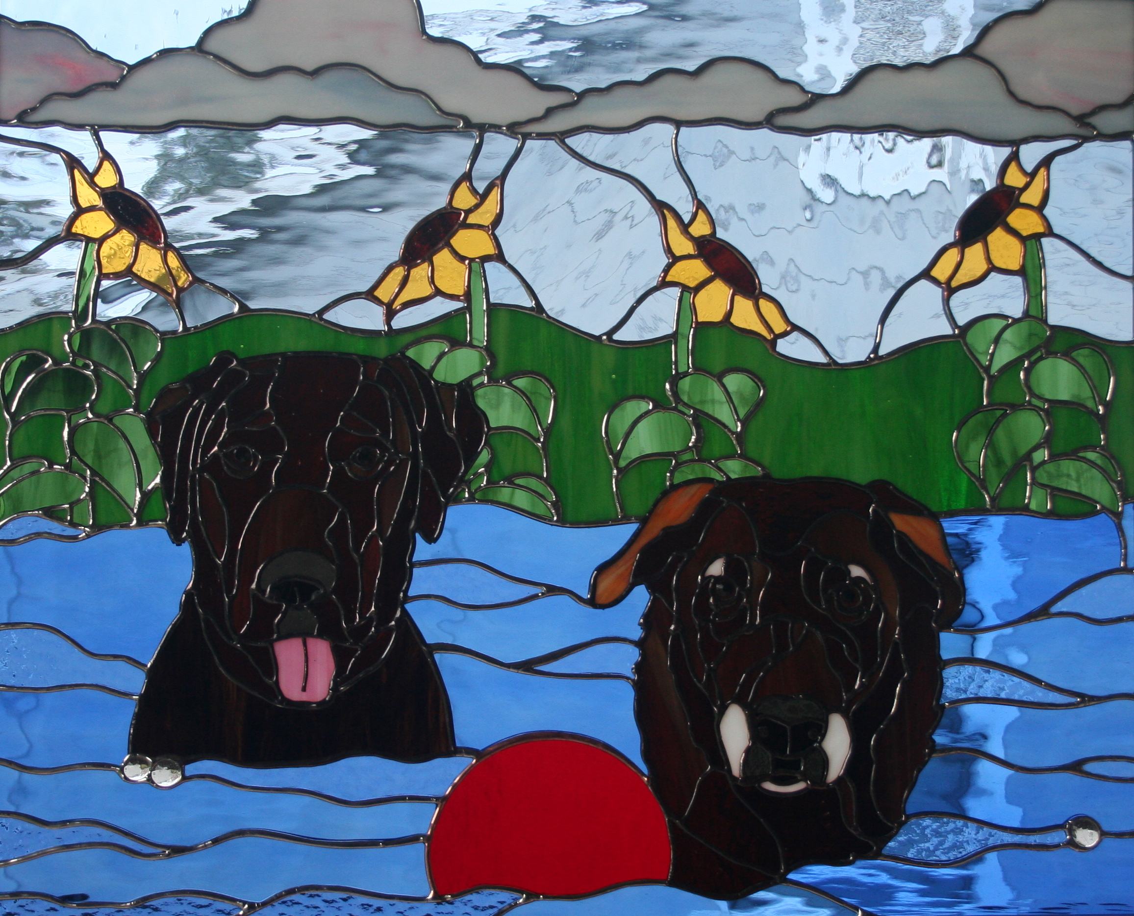 This piece was also a Christmas gift, for a sister, of her adored chocolate labs, Tori and Lucy. They had a swimming pool to play in, and their mom has a lush garden with one of her fave flowers, the sunflower, growing in it, so i incorporated those elements into the pattern.